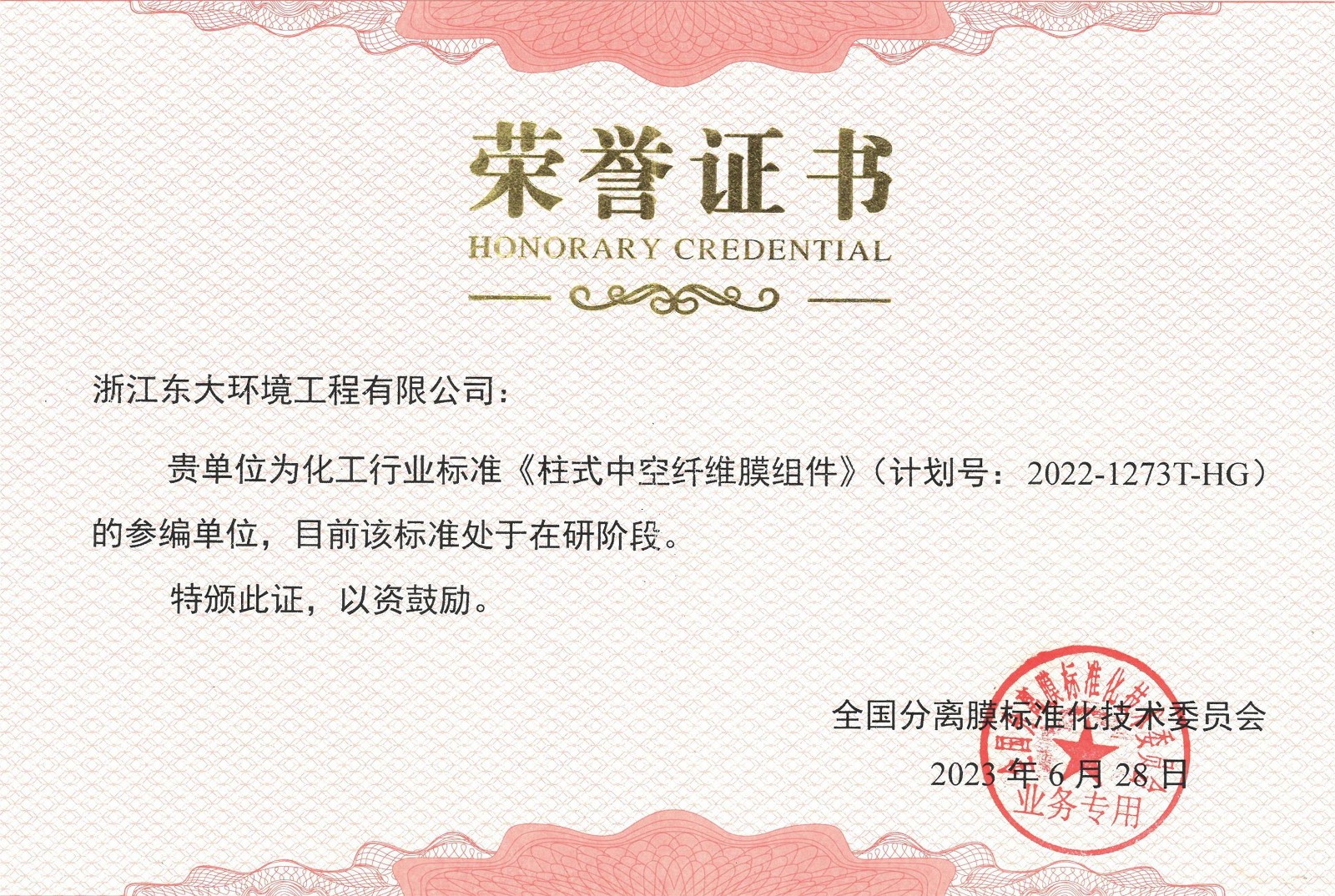 化工行業標準參編證書